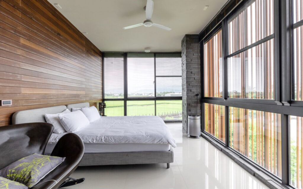 HA house 秋,位於宜蘭冬山,是一個以生活美學為主題的空間,由德築集團打造的私人住家作品。 它最大的特色是周圍環繞著清淺的湧泉和緩坡綠地,並種植了落羽松,四季景觀各有特色。位於宜蘭冬山鄉自然湧泉區的柯林村,漫步在片片田疇相會的柯林路間,前往HA House的不遠處就能看見她四方分明的屋宅身影,一襲天然色系的花崗石與金檀木所包覆的立面,宛如一座與世隔絕的「入田」居島中,以寧靜謙柔同時展顯剛毅的姿態矗立於綠地之上。再拐個彎,就能從環抱外圍的一片落羽松林之間,瞥見HA House的另一立面;沉著的灰色花崗石以及與木作立面同色的金屬格柵外牆,清晰俐落卻不相互混淆的四邊立面彼此制衡。