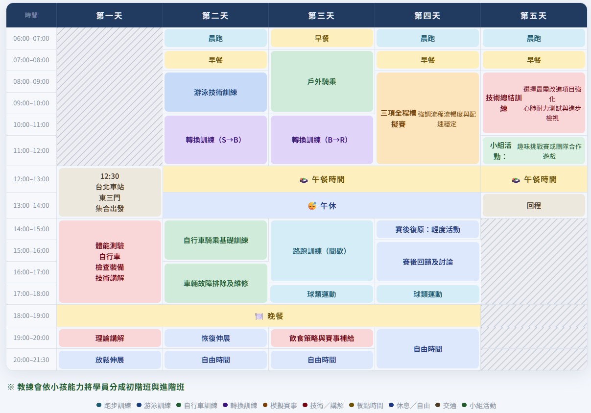 移訓更將品格教育貫穿每個環節,從一次不放棄的練習、一個伸出援手的瞬間,讓孩子學會堅持到底、學會為團隊負責,帶走的不只是體能,更是一輩子受用的強大心志。鐵人從來不是天生的,是一步一腳印練出來的!