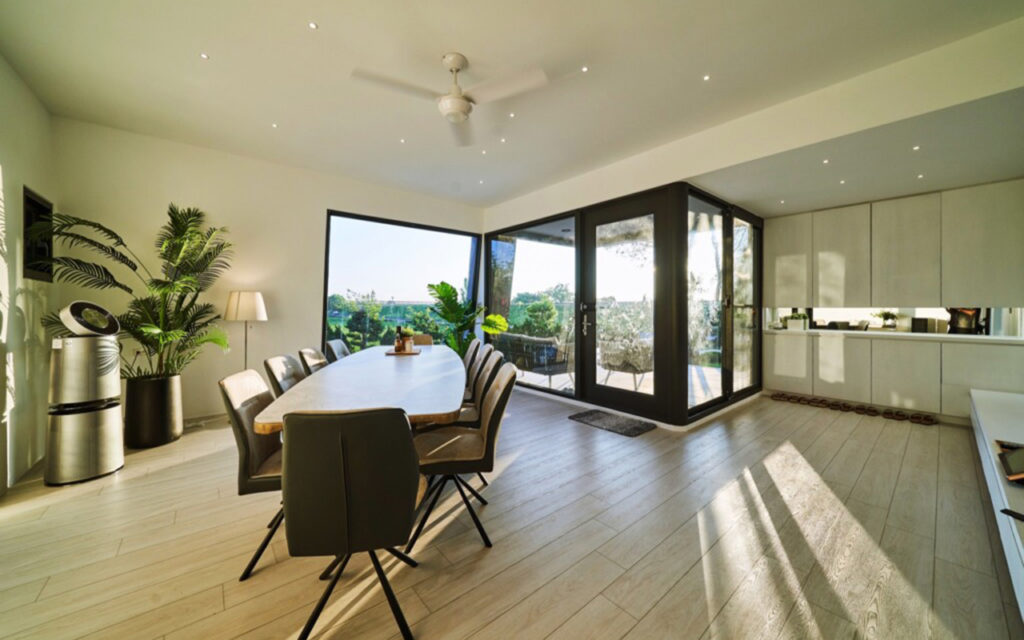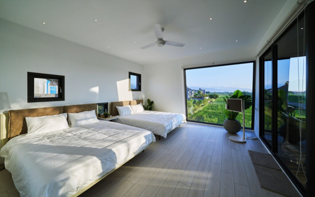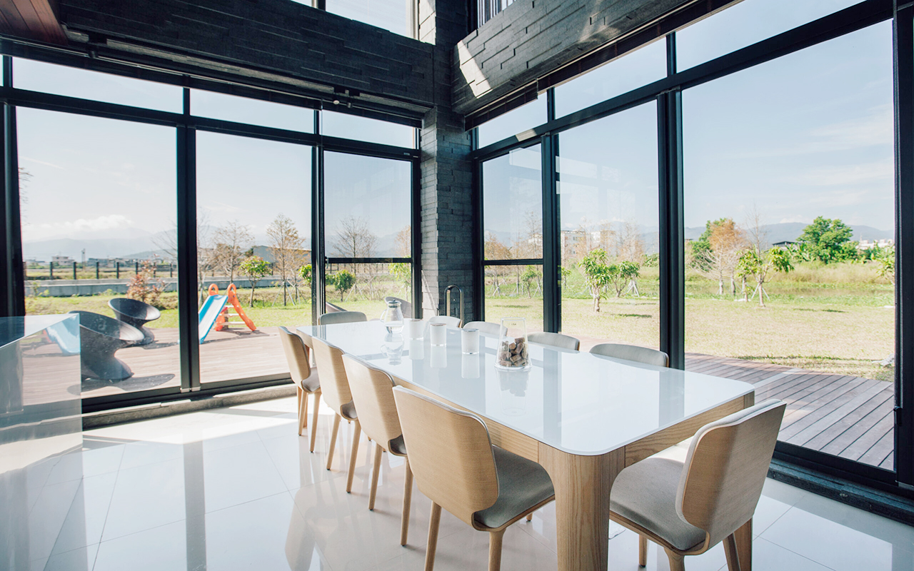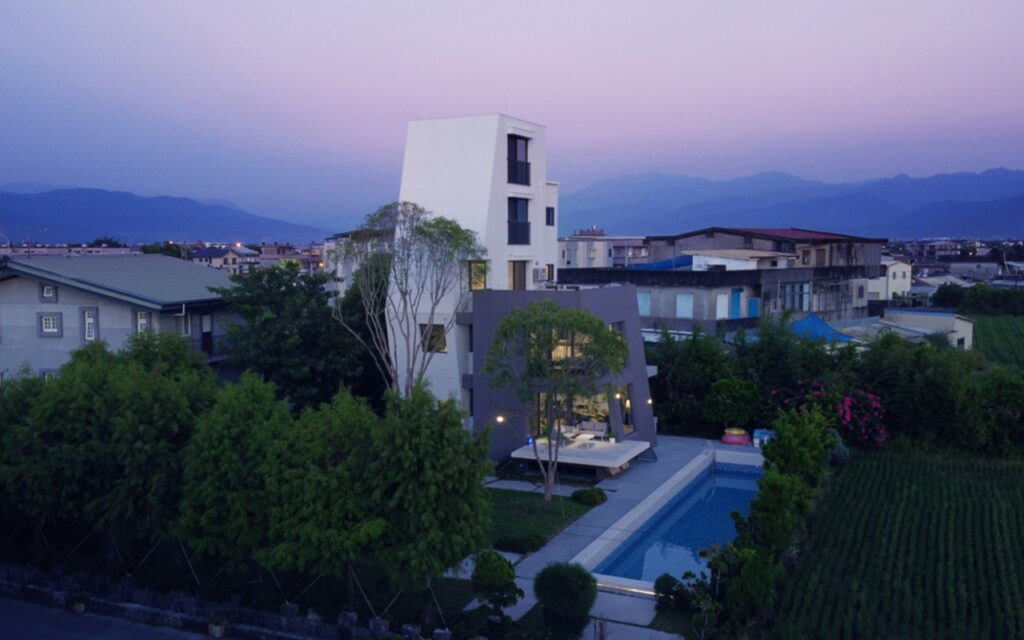 行駛在羅東市區往三星方向前進的交通要道歪仔歪橋上,往右手邊的河岸望去,遠遠可以看見HA House夏在光蠟樹的映襯下,優雅矗立在宜蘭的土地上。HA House夏位於宜蘭三星安農溪畔,是一棟擁有地下一層樓和地上五層樓的建築,建築整體以白色現代簡約的外觀設計,使用大片玻璃帷幕、落地窗,與周圍自然環境以及藍天白雲融合形成更緊密的互動,構築出與自然和諧共生的居住空間。