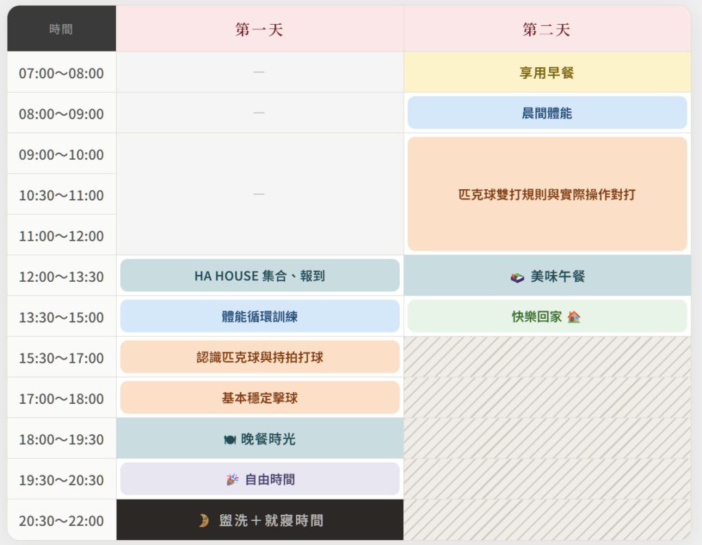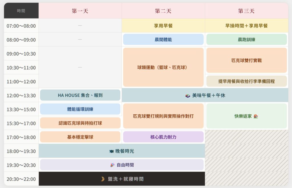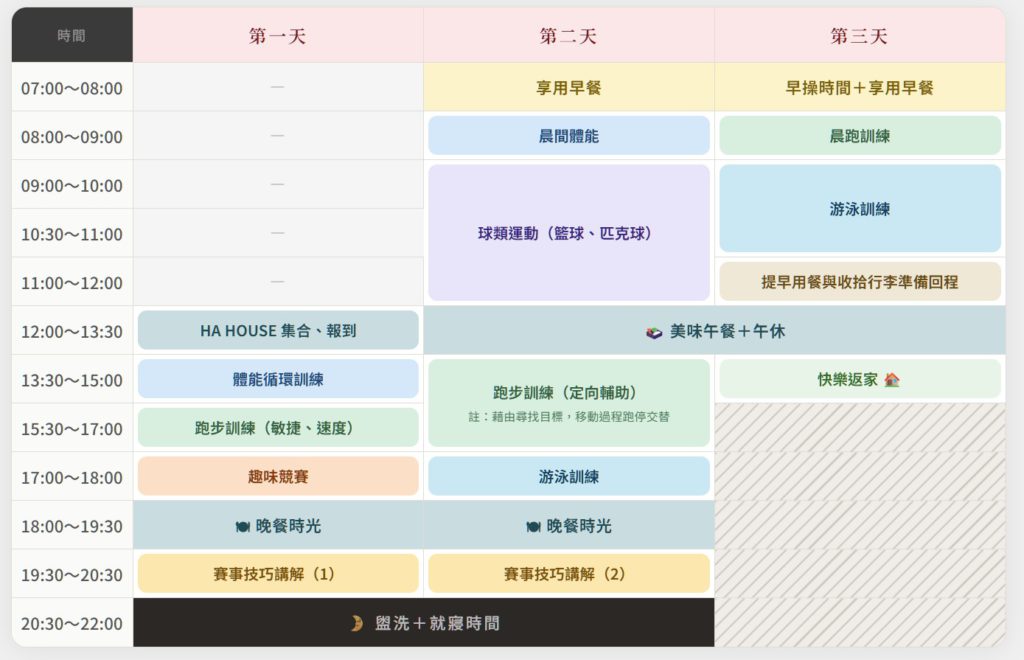 除了固定的冬令營與夏令營外,每個月還有許多假期,無論是2天1夜或是3天2夜,我們提供家長們可自由選擇時間對客製化的營隊。除了保留我們原先深受家長與小朋友喜愛的游泳、跑步與體適能等核心內容,也可加入匹克球等球類項目,透過不同運動形式的交錯安排,讓孩子在活動中持續累積基本體能,並維持良好的心肺耐力、協調性與肌力發展。這樣的課程設計不僅能避免單一運動造成的疲乏,也能提升運動的趣味性與參與度,讓孩子在遊戲與挑戰中自然建立體能基礎。
