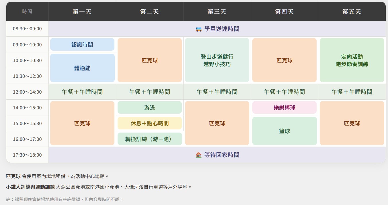 白天有專業教練帶領夏匹克球技術訓練與團隊對戰,感受揮拍得分的超級快感;戶外運動讓孩子走出舒適圈,用身體探索、用勇氣突破!營隊更將品格教育融入每個活動環節——學會負責、懂得鼓勵隊友、在輸贏之間培養真正的運動精神。這個暑假,不只是玩,是成長!帶著球拍來,帶著自信回家。