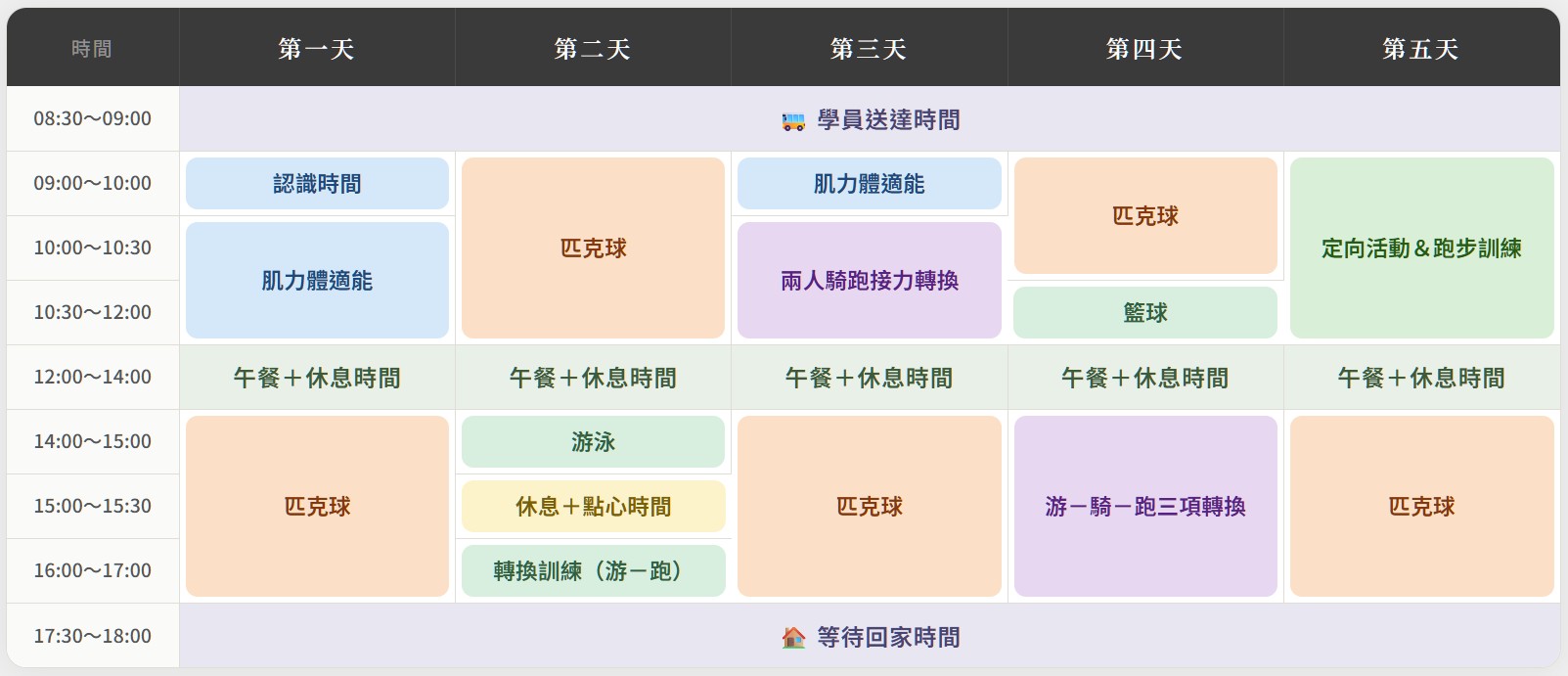 白天有專業教練帶領夏匹克球技術訓練與團隊對戰,感受揮拍得分的超級快感;戶外運動讓孩子走出舒適圈,用身體探索、用勇氣突破!營隊更將品格教育融入每個活動環節——學會負責、懂得鼓勵隊友、在輸贏之間培養真正的運動精神。這個暑假,不只是玩,是成長!帶著球拍來,帶著自信回家。